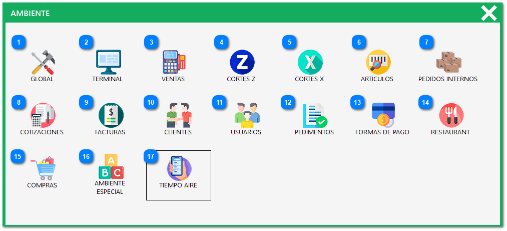 Esta interfaz corresponde al apartado de Ambiente Especial, el cual permite acceder a configuraciones personalizadas para giros de negocio específicos.