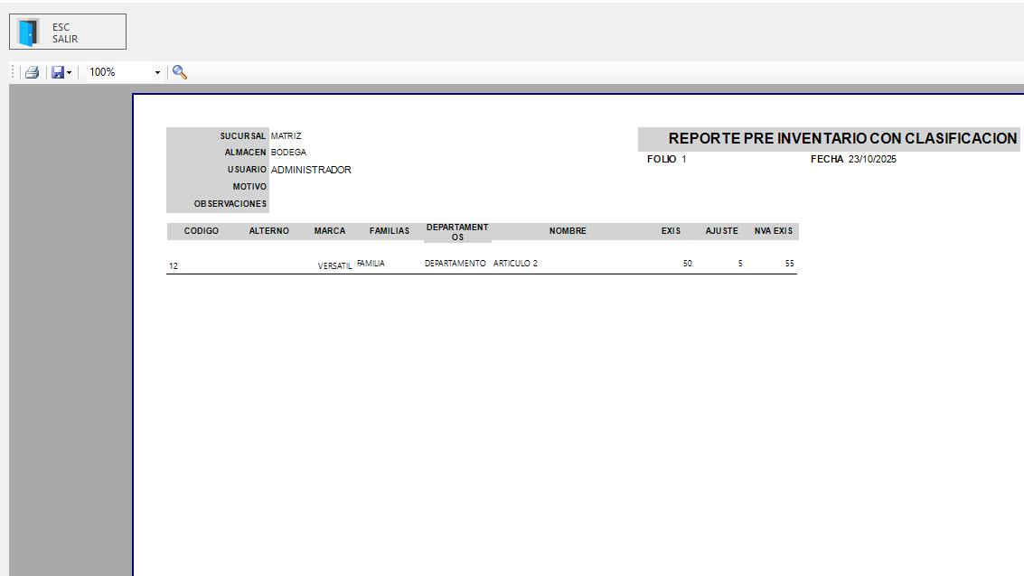 Permite exportar el reporte del pre-inventario filtrado por clasificación (Familias, Departamentos, ajustes etc.).